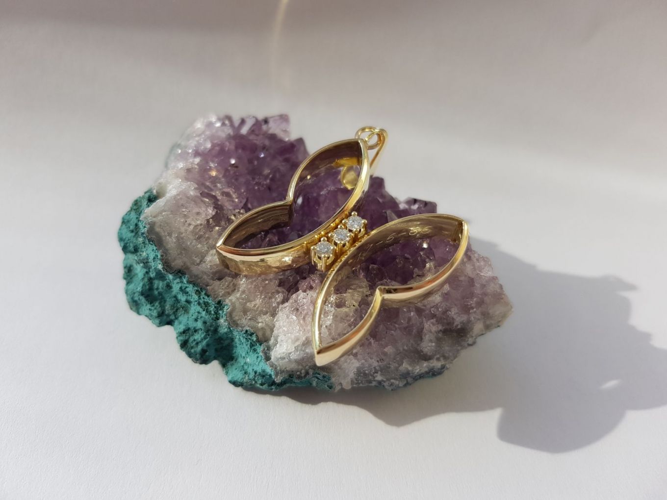 Deze hanger is gemaakt van de trouwringen van haar overleden ouders. De gravures zijn hierbij behouden.